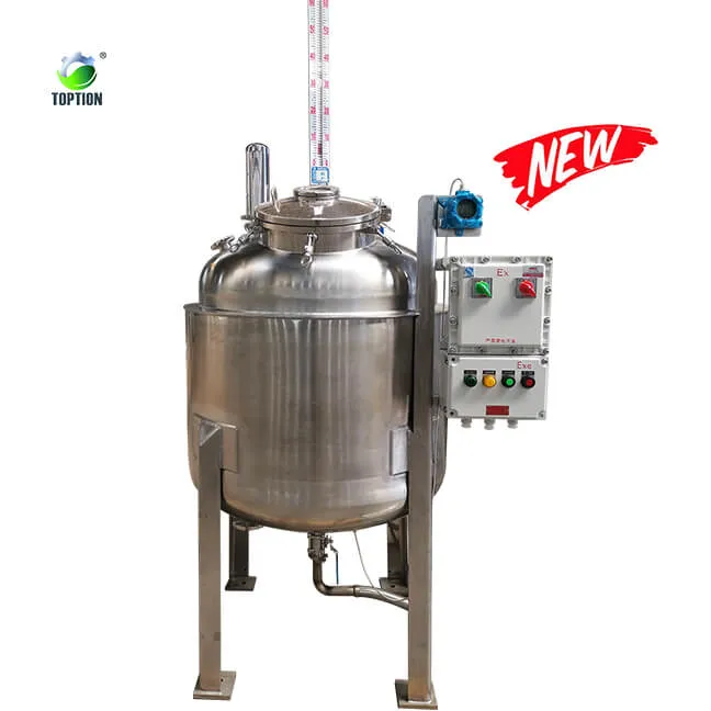 TOPTIONステンレス鋼貯蔵タンクは、プロフェッショナルなカスタマイズ、二重層、単層、および広い容量範囲のカスタマイズをサポートしています。エタノール遠心抽出前のアルコール事前凍結については、凍結前の効果を達成するために二重層、一致する冷蔵庫を選択してください。濾過後の液体貯蔵のために、安定した連続的な供給の目的を達成するために蒸発器に入る前に緩衝するために主に使用される単層貯蔵タンクが選択される。